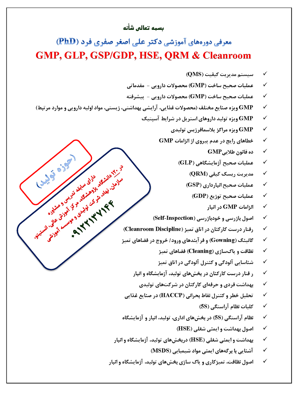 جهت برگزاری دوره آموزشی عملیات صحیح ساخت (GMP) تکمیلی / پیشرفته