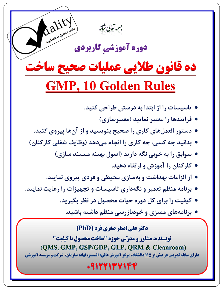جهت برگزاری دوره آموزشی ده قانون طلایی عملیات صحیح ساخت (GMP)