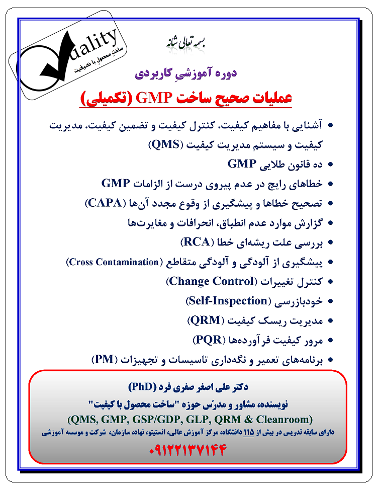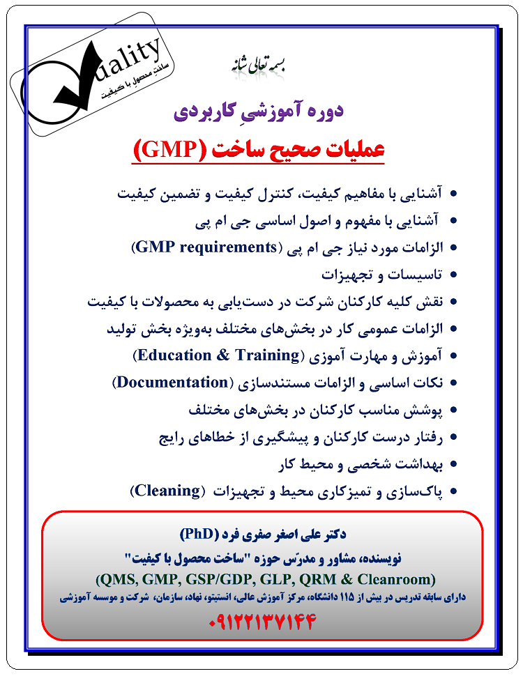 جهت برگزاری دوره آموزشی عملیات صحیح ساخت (GMP) تکمیلی / پیشرفته