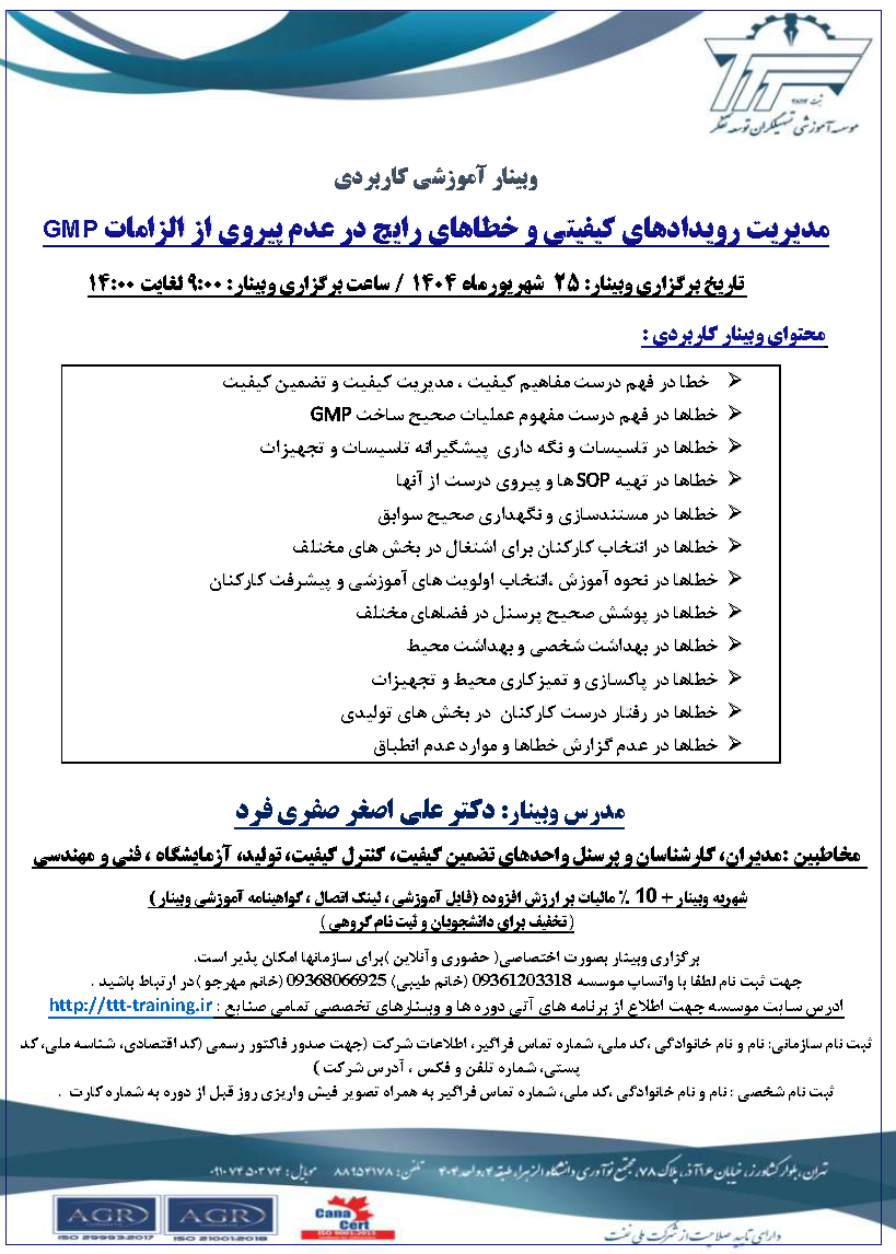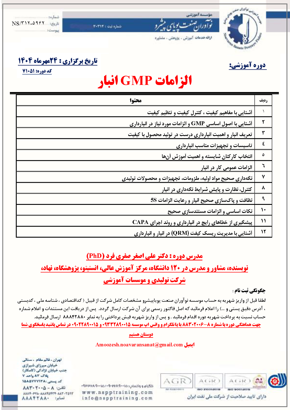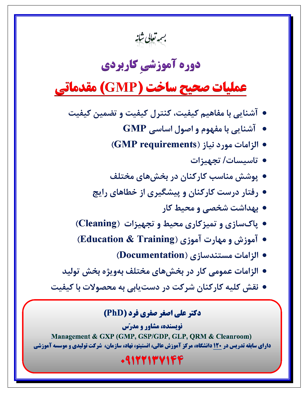 جهت برگزاری دوره آموزشی عملیات صحیح ساخت (GMP) مقدماتی