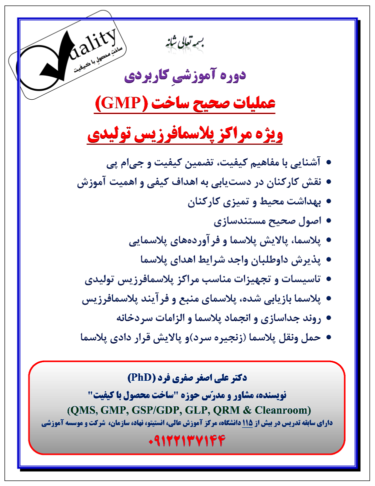 معرفی دوره آموزشی عملیات صحیح ساخت (GMP) ویژه مراکز پلاسمافرزیس تولیدی